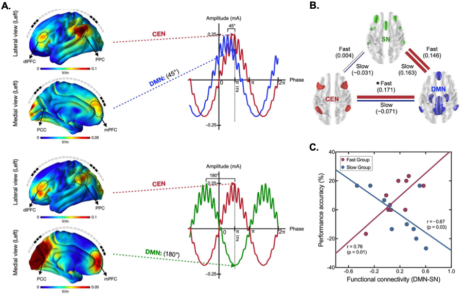 (그림) A. 중앙 처리 네트워크(CEN)와 기본 상태 네트워크(DMN) 사이에 45도 혹은 180도 위상차 뇌자극 신호. B. 뇌자극에 의한, 중앙 처리 네트워크(CEN), 기본 상태 네트워크(DMN)와 현저 네트워크(salience network) 사이의 기능적 연결성의 변화. 빠르게 반응하는 그룹(Fast)과 느리게 반응하는 그룹(Slow) 사이에 180도 위상차 뇌자극 대비, 45도 위상차 뇌자극에서의 양(붉은선)과 음(파란선)의 기능적 연결성 변화의 차이를 보여줌(별 표시는 통계적 유의함을 나타냄). C. 180도 위상차 뇌자극 대비, 45도 위상차 뇌자극에서의 기본 상태 네트워크(DMN)와 현저 네트워크(SN) 사이의 기능적 연결성과 과제 수행 정확도 사이에, 과제를 빠르게 수행하는 그룹(Fast Group)에서는 양의 상관관계를 보여주고, 느리게 수행하는 그룹(Slow Group)에서는 음의 상관관계를 보여줌.